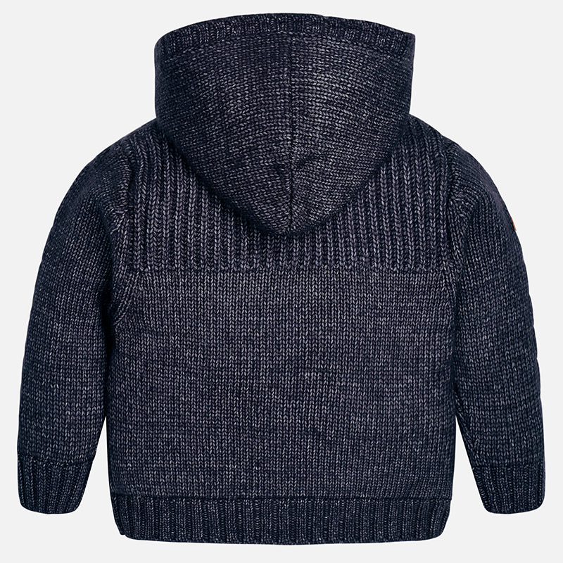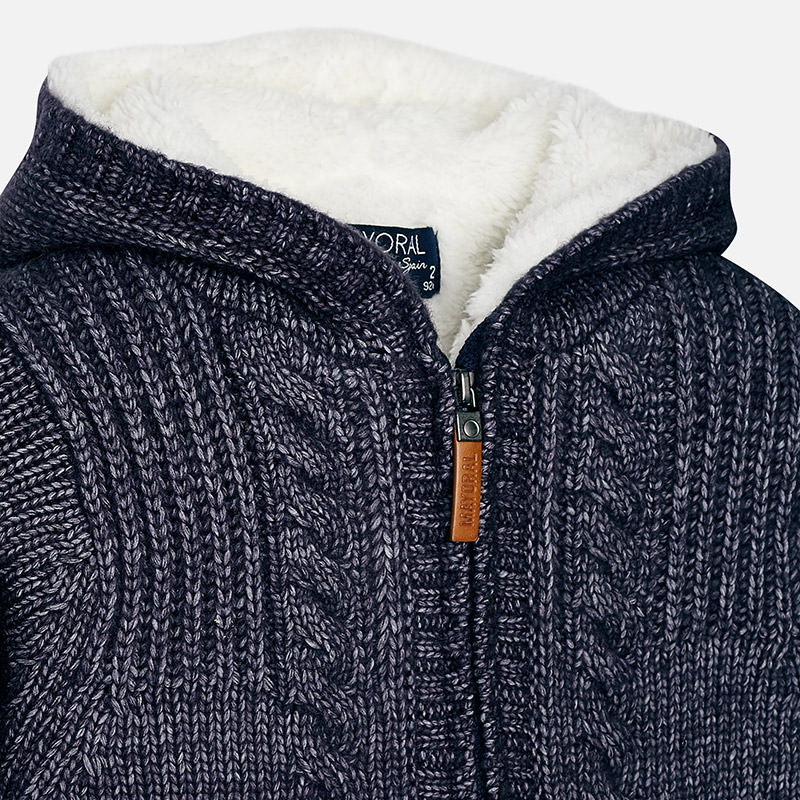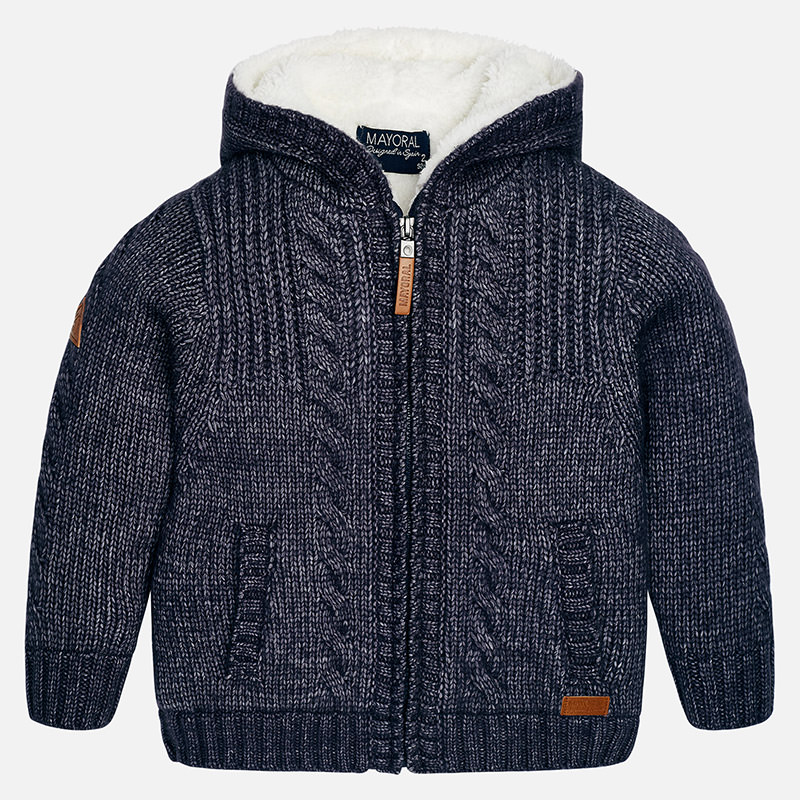 Boys will love to cuddle up when it's cold outside in this cosy, knitted cardigan by Mayoral. Made in a navy blue acrylic and wool blend, it has a super soft, fleecy lining and a chunky zip fastener to keep little one warm and toasty.