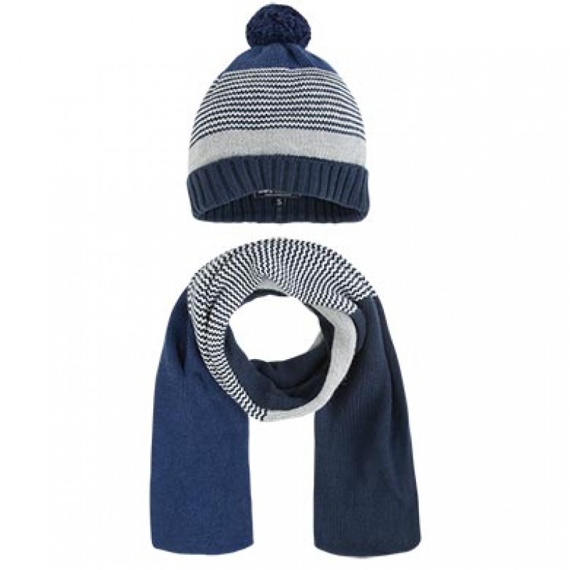 With this knit set with different stiches and colours, he will feel extra warm and bundled up this winter. Reversible scarf with stripes on one side and plain on the other, and hat with rib knit on hte rolled hem and a pompom.