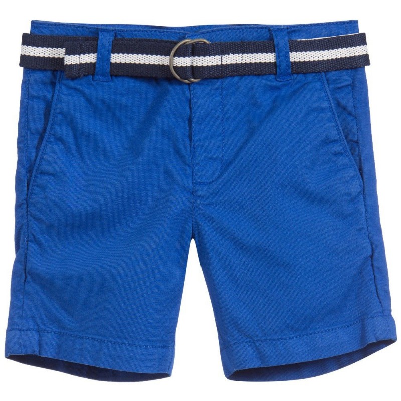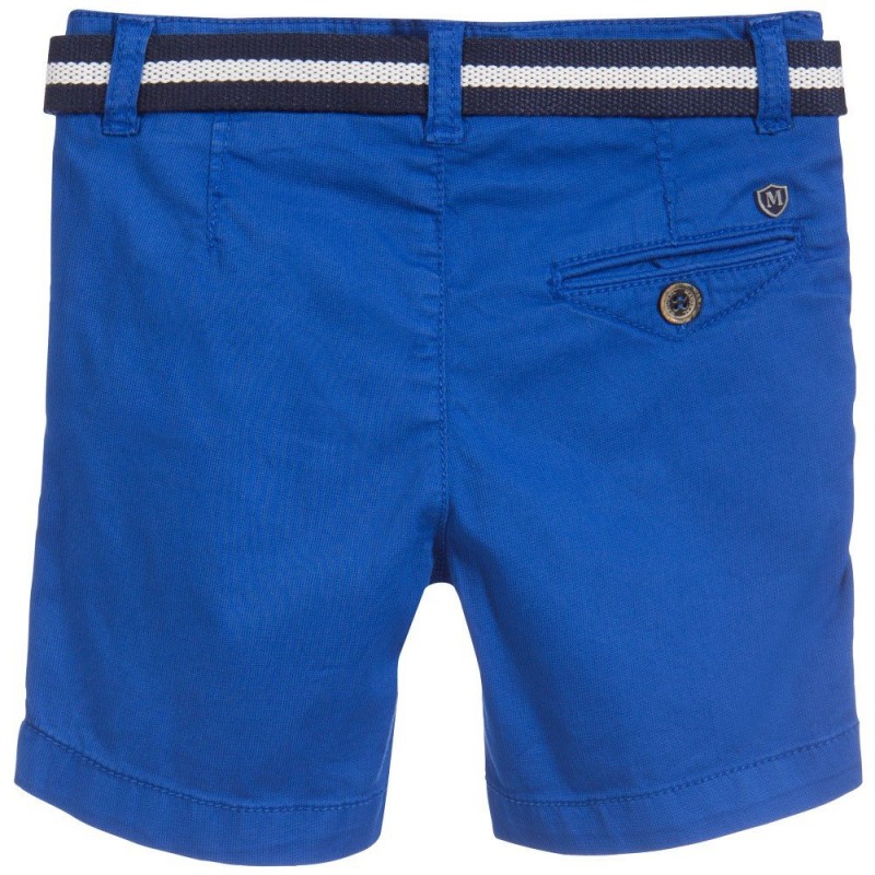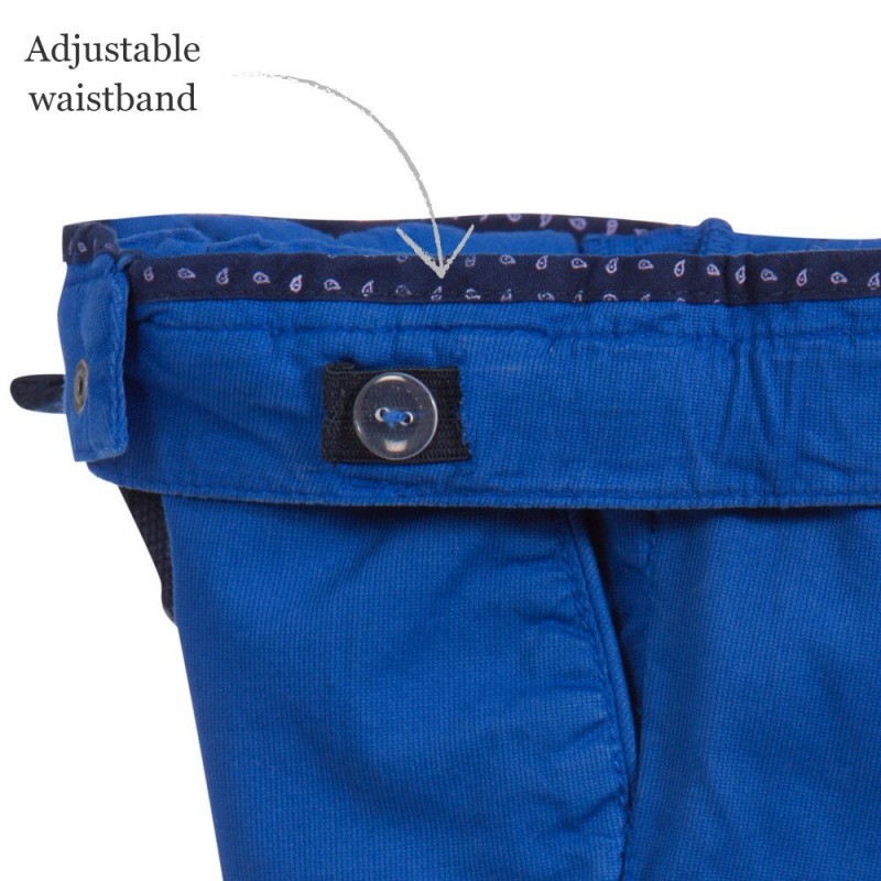 Boys blue cotton shorts by Mayoral made with fine needlepoint cord. The waistband is adjustable, has a navy blue and white woven belt, closing with a popper. The shorts have two front side pockets and one buttoned back pocket. There is a paisley-like navy blue patterned trim on the inner side seam of the legs, which can be seen if the legs are turned up.