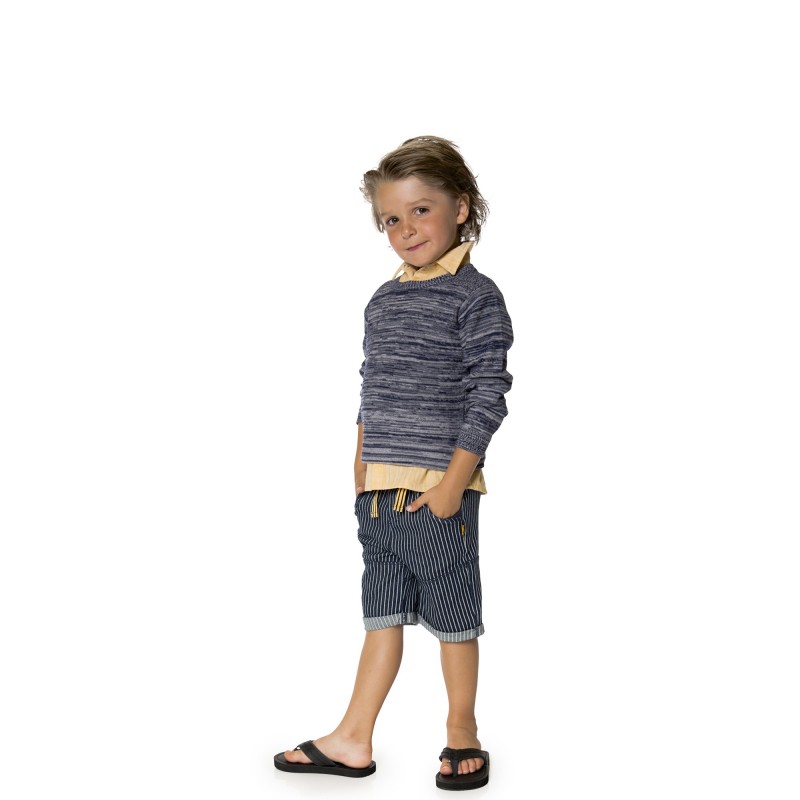 Stretch twill thin stripe shorts. Front pockets and cuffs. Elastic waistband.
