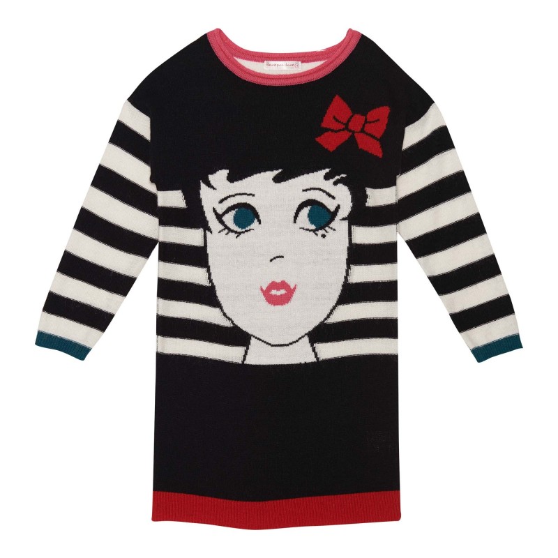 This knit dress with intarsia girl face on the front will be perefect for her this winter. The stripes on the sleeves and in the back give this dress a casual look. Wear with leggings.