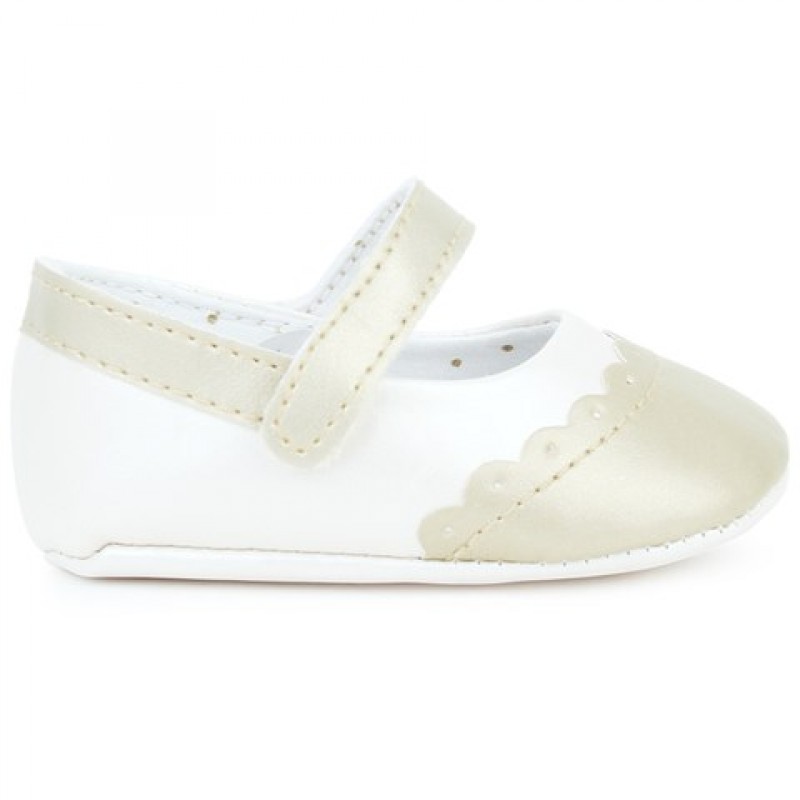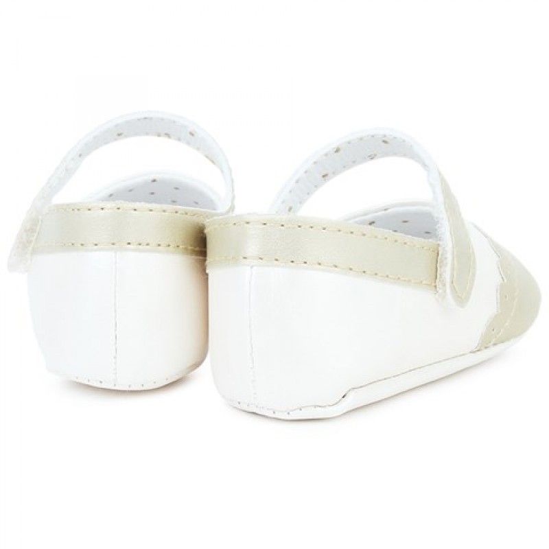 These white and gold Mary-Janes feature gold scalloped detail to the toe and gold trimming, as well as a gold velcro strap. Made from a soft and supple material, she's sure to feel comfortable in this pretty pair.